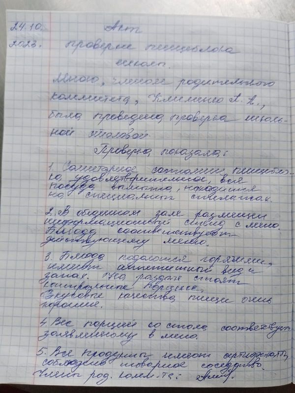 Родительским комитетом проведена проверка пищеблока школы. Было проверено санитарной состояние, доступность информации ежедневного меню, рациона и т. д., внешний вид блюд, их вкусовые качества и вес порций, наличие сертификатов качества, соблюдение соседству при хранении. Члены родительского комитета по всем вопросам нарушений не выявили.