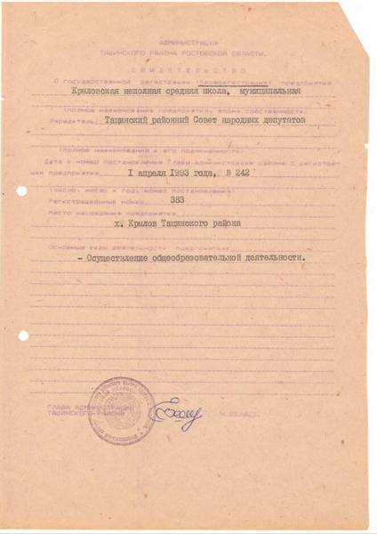 1 апреля 1993 года школа решением Администрации Тацинского района была зарегистрирована как Крыловская неполная средняя школа.