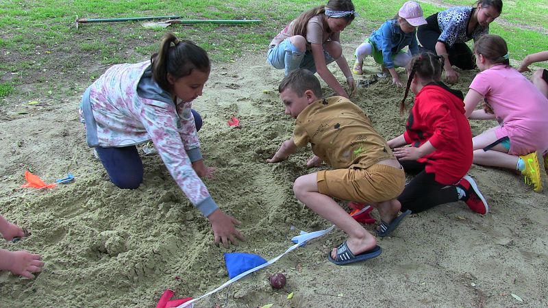 На станции «Спортивная» дети ходили по бревну, искали в песке зарытые «арбузики» ( теннисные шарики).