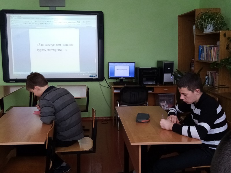 Важным моментом стало обсуждение вопроса курения среди подростков. Посмотрели видеофильм о вреде курения, высказали свое отношение к этой проблеме. Назвали основные причины, по которым они не планируют курение в своей жизни. Поиграли в игру «Перевертыши», показали свои знания в викторине «В объятиях табачного дыма»