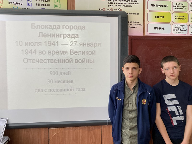 Для учащихся 7 класса был проведён классный час на тему «Дети Блокады». Дети узнали, что значат такие слова как «блокада», «Ладога», «Дорога жизни». Поговорили о войне, о горе, которое она принесла, о подвигах детей во время войны. В заключение беседы ребята посмотрели документальный фильм, посвящённый Блокаде Ленинграда.