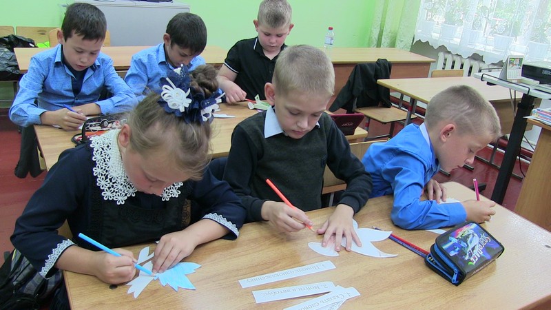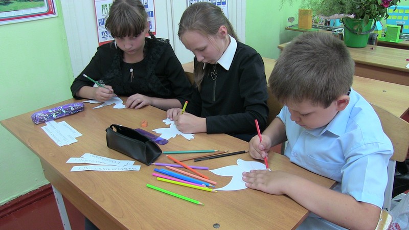 Символом доброты и добрых дел было улыбающееся солнышко. Ребята разделились на 3 группы для выполнения заданий. Задания были разнообразные: вставить пропущенное слово в пословицу, найти добрые фразы на карточках, прослушать рассказ В.Сухомлинского «Как на свете жить» и обсудить его, изготовить птичку доброты для подарка своим родным . Все ребята эмоционально погрузились в тему классного часа, воспринимали всё серьёзно и осознанно. На занятии царила атмосфера сотрудничества и психологического комфорта.