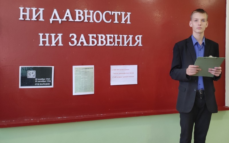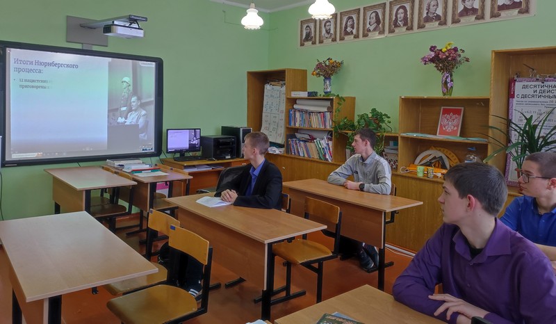 В ходе урока советник директора по воспитанию Пиркина М. С. показала кадры кинохроники Нюрнбергского процесса и рассказала ученикам про «Суд истории», на котором были вынесены обвинения главным нацистским преступникам, участвовавшим в преступлениях против мира и человечности.