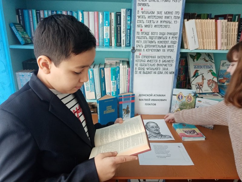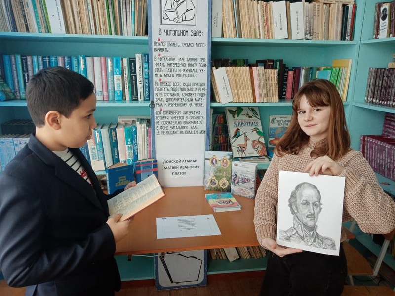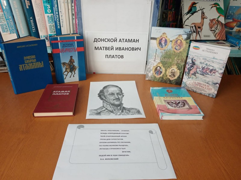 В школьной библиотеке оформлена книжная выставка - «Легенда Дона – Матвей Платов», рассказывающая о нашем земляке. Книги М.П. Астапенко, А.В. Шишова, А.Ф. Корольченко, представленные на выставке, расскажут о жизни и ратных подвигах Атамана Платова, имя которого для казаков Всевеликого войска Донского олицетворяет собой казачью доблесть, верность Отечеству, готовность к самопожертвованию.