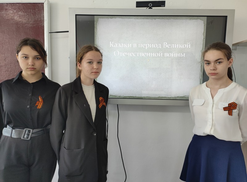 В 7 классе прошел классный час «Казаки в период Великой Отечественной войны». Ребята узнали о событиях войны на территории нашей малой Родины – Донского края. Пополнили копилку знаний интересными сведениями о казаках- героях времён этой войны. Они узнали о вкладе Донских казаков в Победу над фашистами. А также делились историями о своих предках- героях, оборонявших Родину.