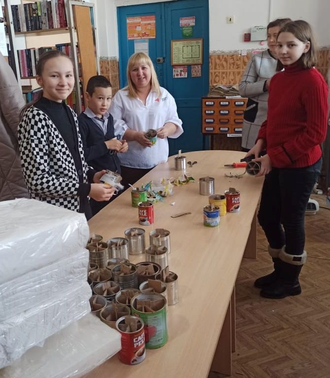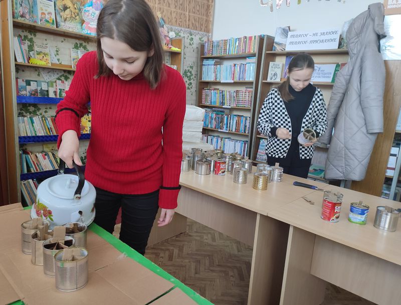 В нашей школе ученики 4-9-х классов помогают участникам специальной военной операции. Ребята делают заготовки для окопных свечей с помощью картона и консервных банок. Далее их заливают в сельской библиотеке совместно с советником, библиотекарем, работниками ДК. Эти свечи передадут тепло детских рук нашим защитникам.