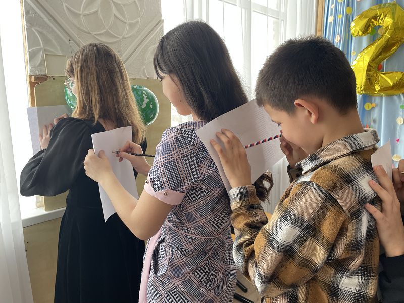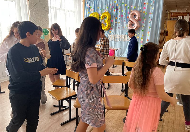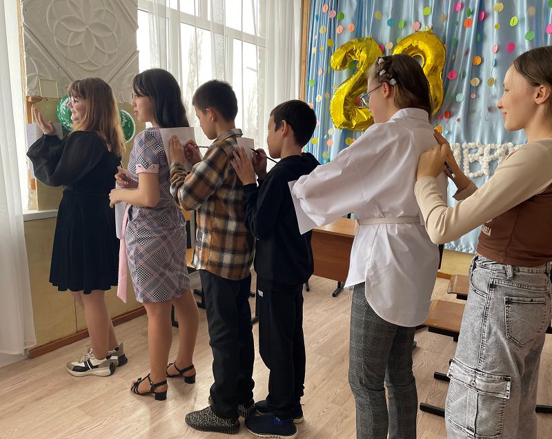 Ребята активно принимали участие в различных конкурсах: рисовали открытку «специальными кистями», отвечали на вопросы, командно пересказывали текст ( чтобы не получился сломанный телефон), становились «стенографистами», мальчики и девочки отвечали на вопросы друг о друге и играли в музыкальные стулья. Итогом всего мероприятия стала праздничная дискотека.