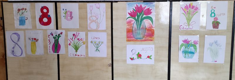 В преддверии Международного женского дня оформлена выставка детских рисунков «8 марта – мамин праздник!». Все свои самые добрые пожелания в адрес любимых мам, бабушек, учителей дети попытались выразить с помощью своих рисунков.