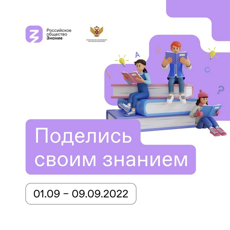 С 1 по 9 сентября по всей стране пройдёт просветительская акция для молодежи «Поделись своим Знанием» от Российского общества «Знание». В рамках акции гуру, эксперты, коучи и просто профессионалы своего дела получают возможность поделиться с молодым поколением своим бесценным опытом и уникальными знаниями.