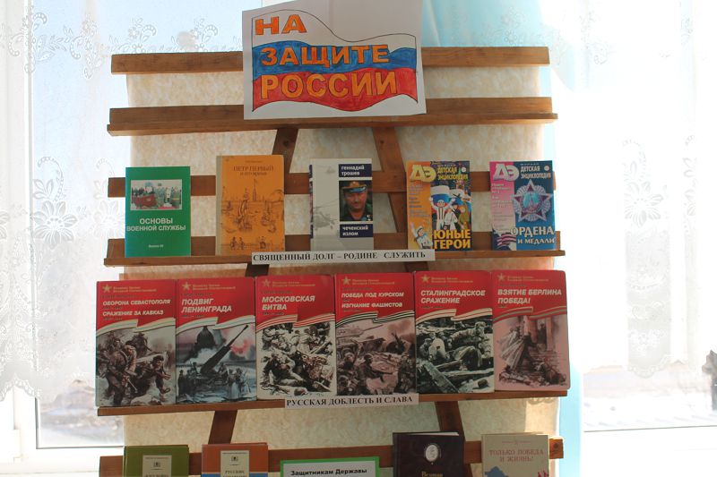 «На защите России» так называется выставка научной, документальной и художественной литературы, которая оформлена в библиотеке нашей школы. Эта выставка организована в рамках плана мероприятий месячника оборонно-массовой и патриотической работы для обучающихся 1-9 классов.