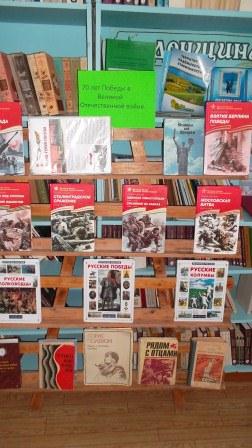 В школьной библиотеке организована выставка тематической литературы, посвященная 70-летию Великой Победы -«Не войны славим, а подвиги народа» .В школьном музее оформлены стенды -" Великой Победе-70" и " Дивизия -освободительница".