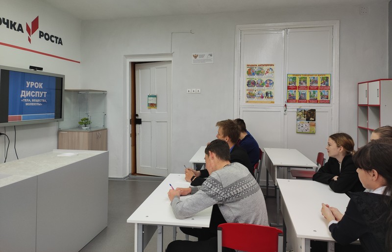 В рамках «Точка роста» в 7-9 классах прошел урок – диспут «Тела, вещества, молекулы» в виде интерактивной игры. Командам были предложены вопросы по следующим темам: «В честь ученых», «История открытия атома», «Строение атома», «Атом и биология. Ребятам предстояло отвечать на вопросы различной сложности, блистая эрудицией и знаниями.